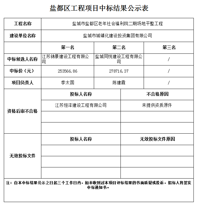 鹽城市鹽都區(qū)老年社會(huì)福利院二期場(chǎng)地平整工程中標(biāo)結(jié)果公示